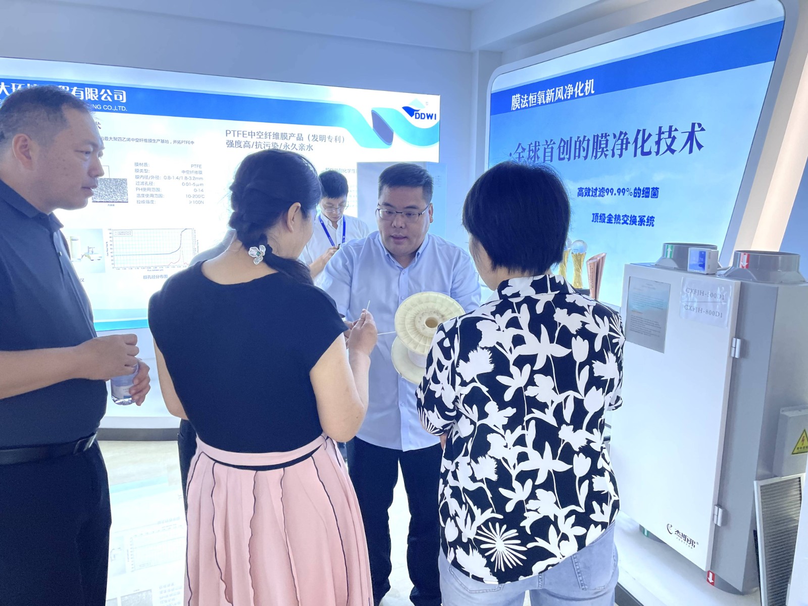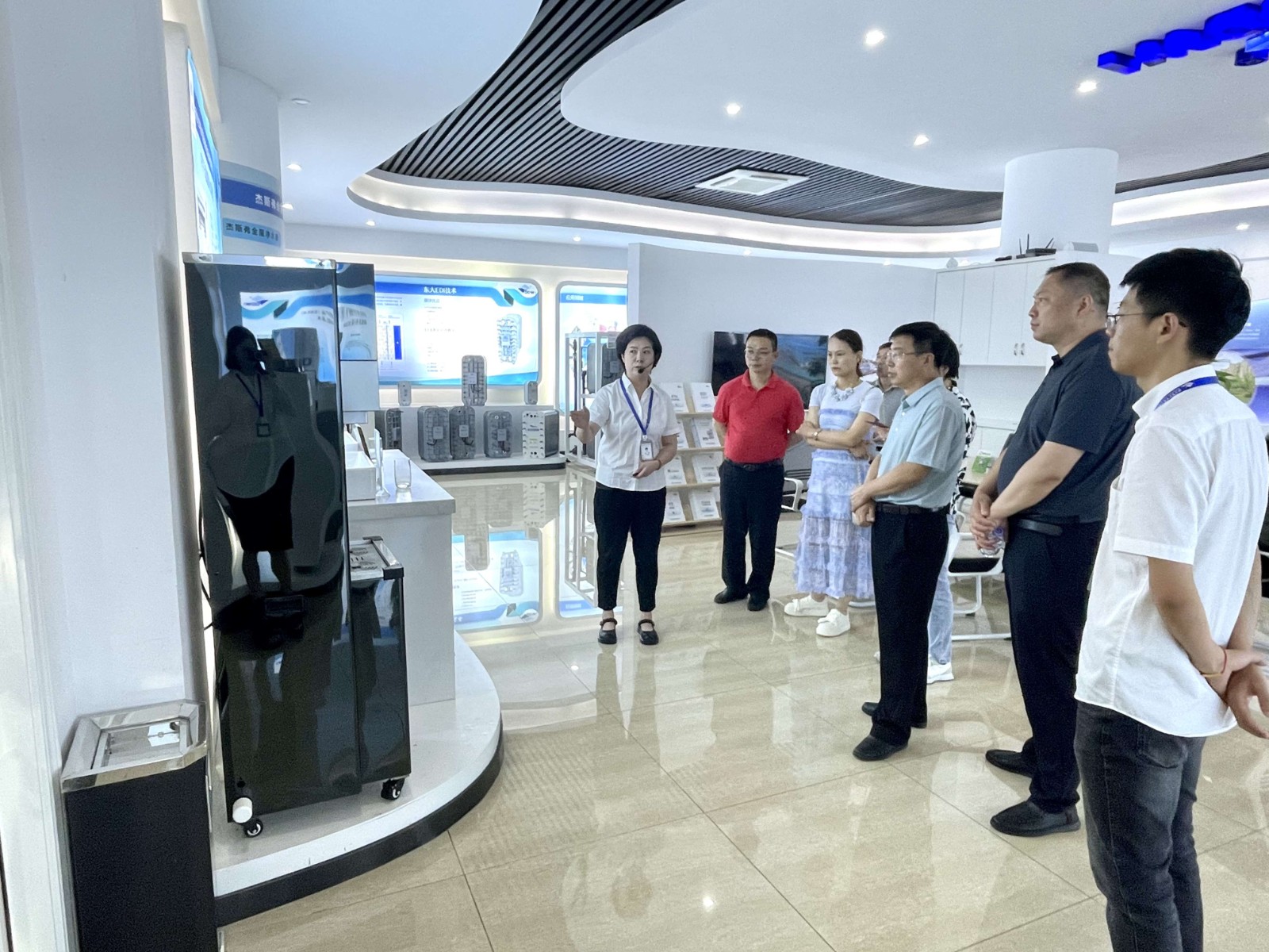 公司展廳,總經理錢建斌、副總經理金王勇為焦瑞河主席一行詳細介紹了公司成立以來立足諸暨市為發展戰略支點,進行綠色環保建設,推動各地區綠色低碳高質量發展中所做出的突出貢獻和企業發展成果。